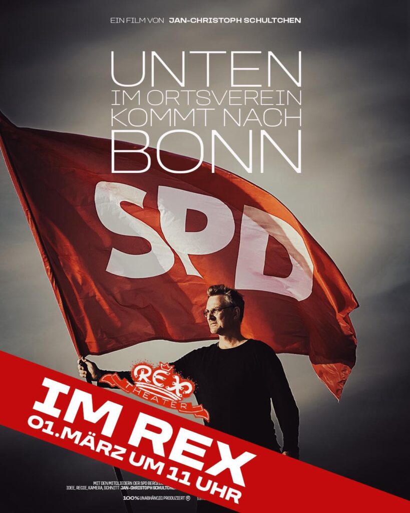 Die politische Willensbildung in der SPD vollzieht sich von unten nach oben. Doch was bedeutet das genau? Wie wird Politik konkret gemacht und gestaltet? Wie viel (Ohn-)Macht herrscht an der Parteibasis? Um diese Fragen zu ergründen, haben Genoss:innen einen Ortsverein mehr als ein Jahr bei der tatsächlichen Arbeit begleitet. Daraus ist ein spannender Film geworden, den wir gern gemeinsam mit mehreren Ortsvereinen der Bonner SPD schauen wollen. Daher laden wir Euch am 1. März um 11 Uhr herzlich ein zur Filmvorführung „Unten“ im Rex-Kino (Frongasse 9) ein. Im Anschluss gibt es auch die Möglichkeit der Diskussion und des Austausches über den Film.
